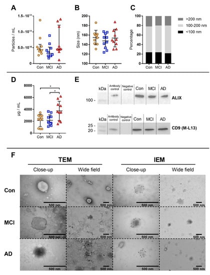 NTA revealed that the particle concentration (Figure 1A), mean particle size (Figure 1B) and size distribution (Figure 1C) were not significantly different between healthy controls and patient groups. However, protein measurements showed a significantly increased protein concentration in AD patients compared to both MCI patients (p = 0.020) and healthy controls (p = 0.019) (Figure 1D). Western blot analysis showed the presence of the EV specific tetraspanin CD9 and the cytosolic protein ALIX in all three groups (Figure 1E), confirming the enrichment of EVs. TEM and IEM confirmed the presence of intact vesicular structures, as well as phenotypical confirmation of CD9+ EVs, within the size range of approximately 200 nm in EV pellets from both controls and patient groups (Figure 1F).