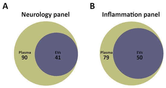 Area proportional Venn diagrams were created for visual representation of number of proteins in plasma and EV samples measured by proximity extension assay (PEA) using the Neurology and Inflammation panels. (A) For the Neurology panel, 90 proteins were detected in plasma with 41 proteins expressed in EV samples and 49 proteins only in plasma. (B) For the Inflammation panel, 79 proteins were detected in plasma with 50 proteins expressed in the EV samples and 29 proteins only in plasma.