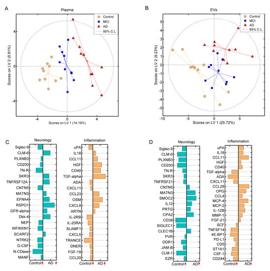 Partial least squared discriminant analysis of proteins from the Neurology and Inflammation panels measured in plasma and EV samples. Scores plots for all three groups measured in (A) plasma and (B) EV samples, where each score represents a sample. Loadings plots of (C) plasma and (D) EV samples, where each loading represents the variation in a specific protein. The larger the bar, the more significant the protein is in sample grouping. The orientation of each loadings’ variable describes if the corresponding protein was found at higher levels in controls compared to AD patients, where the vertical arrows were provided to facilitate interpretation.