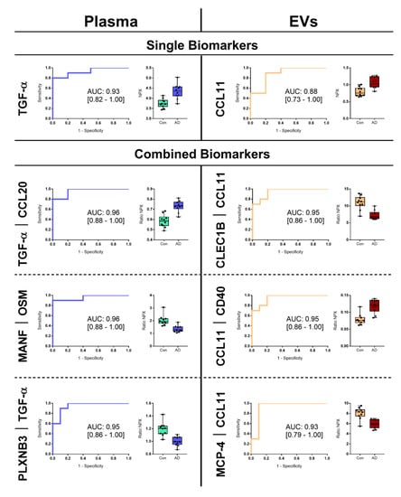 ROC curves were made to ascertain diagnostic capabilities of proteins identified by the PLSDA models and FDR significance of single proteins for plasma and EVs. For both plasma and EV matrices, one protein and 19 protein ratios showed significance, with a set inclusion criteria for ROC curves with an AUC > 0.80 and with a 95% confidence interval (CI) 0.70–1.00 (Table 4). For single proteins with FDR significance; TGF-α (AUC: 0.93, 95% CI: 0.82–1.00, p: 0.001) for plasma and CCL11 (AUC: 0.86, 95% CI: 0.73–1.00, p: 0.004) for EVs showed noteworthy results for diagnostics when comparing controls and patients with AD (Figure 4). The top three combined biomarkers showed great diagnostic performance for plasma (ratios TGF-α and C-C motif chemokine 20 (CCL20) (AUCTGF-α │ CCL20: 0.96, 95% CI: 0.88–1.00, p: 0.001); mesencephalic astrocyte-derived neurotrophic factor (MANF) and oncostatin-M (OSM) (AUCMANF │ OSM: 0.96, 95% CI: 0.88–1.00, p: 0.001); plexin-B3 (PLXNB3) and TGF-α (AUCPLXNB3 │ TGF-α: 0.95, 95% CI: 0.86–1.00, p: 0.001)) and EVs (ratios c-type lectin domain family 1 member B (CLEC1B) and CCL11 (AUCCLEC1B │ CCL11: 0.95, 95% CI: 0.86–1.00, p: 0.001); CCL11 and CD40 (AUCCCL11 │ CD40: 0.95, 95% CI: 0.86–1.00, p: 0.001); monocyte chemotactic protein 4 (MCP-4) and CCL11 (AUCMCP-4 │ CCL11: 0.93, 95% CI: 0.79–1.00, p: 0.001)) when comparing healthy controls with AD patients (Figure 4).