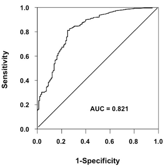 Receiver operating characteristic (ROC) curve for the accuracy of γ-GT for identifying patients with endothelial dysfunction. The accuracy of γ-GT for identifying patients with endothelial dysfunction is 82.1% (AUC = 0.821, p < 0.001).