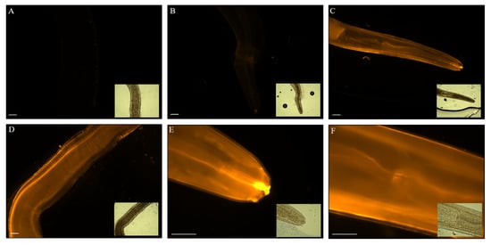 Anisakis spp. L3 cultured for 16 h in the presence of 0 µM (A), 1 µM (B) or 4 µM (C–F) DOPE-Rho prior to washing, fixation with 4% paraformaldehyde and analysis using fluorescence microscopy. Orange = Rhodamine, Scale bar: 100 µm. Corresponding bright-field images are inset.
