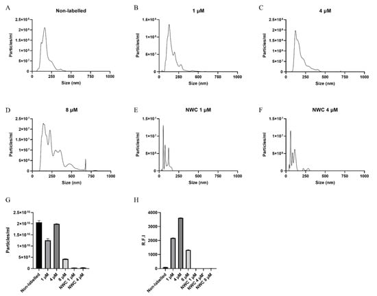 Nanoparticle tracking analysis of non-labelled EVs isolated from Anisakis spp. culture media showed EVs released had a modal size of 140.5 nm (±7.3 nm) with a mean concentration of 2.06 × 1010 (±8.68 × 108) particles/mL (Figure 3A,G). EVs isolated from Anisakis spp. incubated with 0, 1, and 4 µM DOPE-Rho had a comparable size distribution, whereas EVs isolated from Anisakis spp. Incubated with 8 µM was shifted towards larger particles (Figure 3A–D). Concentration of particles in the EV sample from 4 µM DOPE-Rho incubated larvae was comparable to that of non-labelled with 1.99 × 1010 (±2.32 × 108) particles/mL. However, a reduction in particle number was observed for 1 µM and a further reduction for 8 µM DOPE-Rho incubated larvae with 1.26 × 1010 (±7.07 × 108) and 4.25 × 109 (±1.14 × 108), respectively (Figure 3G). The dye controls contained particles comparable to what is present in the diluent PBS and were not fluorescent (Figure 3G,H).