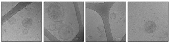 Samples were defrosted and subjugated to short centrifugation to remove aggregates introduced by the freeze-thaw cycle with a Qualitron DW-41. Samples were prepared in an automated plunge freezer system (Leica Microsystems, Wetzlar, Germany). A 4 µL drop of the sample was dispersed on a glow discharged lacey formvar carbon-coated copper grids (Ted Pella Inc, Redding, CA, USA), blotted with a filter paper and then plunged into liquid ethane (approximately −183 °C). The vitrified specimens were thereafter stored in liquid nitrogen (−196 °C) prior to imaging. A Fischione Model 2550 cryo transfer tomography holder was used to transfer the specimen into the electron microscope, JEM 2200FS (JEOL, Tokyo, Japan), equipped with an in-column energy filter (Omega filter), which allows zero-loss imaging. The acceleration voltage was 200kV and energy-filtered images were digitally recorded with a TVIPS F416 camera using SerialEM under low dose conditions with a 25 eV slit in place. Images were processed in ImageJ 1.52a (NIH).