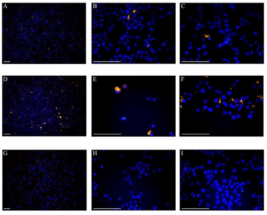 To further evaluate this EV labelling method, uptake of labelled Anisakis spp. EVs was assessed in PMA activated THP-1 cells. As Cryo-EM determined that the EVs from Anisakis spp. labelled with 1 µM DOPE-Rho were the purest, this was used for uptake study. Fluorescent EVs were added at 2 µg or 8 µg (total protein of non-lysed EVs) per well and uptake was assessed using fluorescence microscopy after overnight incubation (Figure 5). Rhodamine fluorescence was detected in a low number of cells incubated with 2 µg DOPE-Rho labelled EVs (Figure 5A–C) with the number of rhodamine positive cells increasing at 8 µg EV treatment (Figure 5D–F). No rhodamine fluorescent signal was observed in cells treated with 12 µg unlabelled EVs (Figure 5G,H) or PBS treated control cells (Figure 5I).