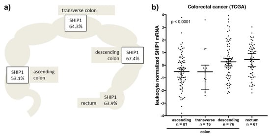 In addition, SHIP1 was associated with left-sided tumor localization (Figure 2a and Figure 3a). This finding was further validated at the RNA level using TCGA data. Although SHIP1 mRNA was not correlated with leukocyte markers in colorectal cancer, it is still obvious that increased leukocyte infiltration will result in enhanced SHIP1 expression in tumor tissue. Therefore, we used subtracted z scores of SHIP1 mRNA and leukocyte markers to compensate for different levels of leukocytes in the tumor tissue. This compensation resulted in a pattern of SHIP1 mRNA in tumor localization, which was very similar to our observed protein expression (Figure 3b).