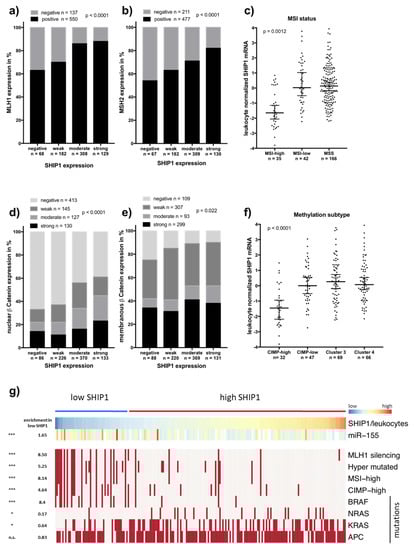 The absence of SHIP1 expression in colorectal cancer is linked to microsatellite instability. (a,b) Immunohistochemistry-scored SHIP1 expression was correlated with expression of MLH1 and MSH2 as markers for microsatellite instability (p > 0.0001, each). (c) Leukocyte normalized SHIP1 mRNA expression from TCGA was analyzed for association with microsatellite status (p = 0.0012). (d,e) Immunohistochemistry-scored SHIP1 expression was correlated with the expression of nuclear and membranous β-Catenin (p > 0.0001 and p = 0.0022, respectively). (f) Leukocyte normalized SHIP1 mRNA expression was analyzed for association with methylation subtypes (p < 0.0001). (g) Leukocyte normalized SHIP1 mRNA expression was classified into low SHIP1 expression (low quartile) and high (upper three quartiles), and hierarchical clustering was performed, showing enrichment of microsatellite instability markers.