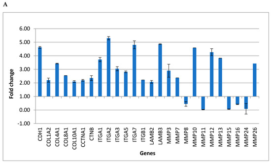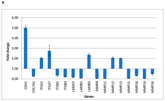 In order to evaluate the effects induced by cyclosporine and mycophenolate, 57 genes belonging to the “Extracellular Matrix and Adhesion Molecules” pathway were amplified in fibroblasts after 24 h of treatment. Table 1 and Table 2 show the gene expression values as a Fold Change following the treatment with mycophenolate and cyclosporine, respectively. The bold values represent the statistically significant results (fold change ≥ 2 and p-value ≤ 0.05 for upregulated genes, and fold change ≤ 0.5 and p-value ≤ 0.05 for significantly downregulated genes) that were collected in Table 3 and Table 4. Following the treatment for 24 h, both substances induced overexpression of the same genes in fibroblasts, including the adhesion molecules CDH1 and genes involved in the deposition of the extracellular matrix such as ITGA2, ITGA7, LAMB3, MMP12, and MMP13. Among the genes significantly downregulated by both treatments there are the extracellular matrix metalloproteases MMP8, MMP11, MMP15, MMP16, MMP24. Figure 1A,B represents significantly expression levels of the genes up- and downregulated in fibroblast cells treated with mycophenolate and cyclosporine, respectively. In order to confirm the expression results obtained by the real-time PCR, it was decided to measure the protein levels of CDH1 by the enzyme immunoassay test (ELISA). The ELISA test confirmed the real-time PCR results showing an increase in CDH1 equal to 5.13-fold ± 0.16 for the mycophenolate treatment and 5.05-fold ± 0.20 for the cyclosporine treatment.