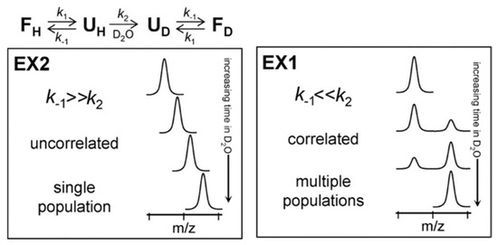 Protein unfolding kinetics and Hydrogen–Deuterium Exchange Mass Spectrometry (HDX-MS) at the top. The two possible mechanisms for hydrogen exchange in proteins, EX1 and EX2. Reproduced with permission from the Journal of the American Society for Mass Spectrometry (© 2006).