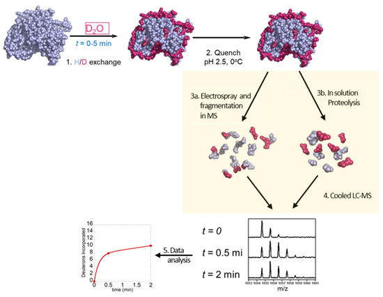 - Brown, K.A.; Wilson, D.J. Bottom-up hydrogen deuterium exchange mass spectrometry: Data analysis and interpretation. Analyst 2017, 142, 2874–2886. [Google Scholar] [CrossRef]
