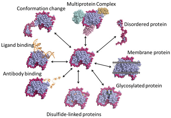 Detailed studies of protein structure and function are critical to understanding the mechanism of biological processes and the cause of various human diseases [1,2]. The vast majority of drugs available as therapeutics bind to proteins and modulate their structure-function relationship [3]. For small-molecule drugs, their impact on the target protein is typically the direct result of only a few non-covalent interactions, although changes in conformation or dynamics may be widespread through allosteric effects. In this case, challenges associated with achieving a molecular-level mechanism for protein function arise largely from the complexity of the target. For instance, various proteins that are an integral part of the cell signaling (and thus tempting drug targets) like NFκB, p53, or proteins associated with amyloid diseases like α-synuclein and tau proteins are abundant in intrinsically disordered regions (IDRs) and are not amenable to traditional structure determination techniques like X-ray crystallography or solution NMR. Adding to these challenges, an increasingly large fraction of biopharmaceutical products are protein/peptide-based drugs, with molecular weights that vary from few kilodaltons to megadaltons [4,5]. When proteins/peptides are used as drug molecules, the complexity of the drug/target interaction is magnified by conformational heterogeneity and the distribution of covalent modifications in the drug itself.