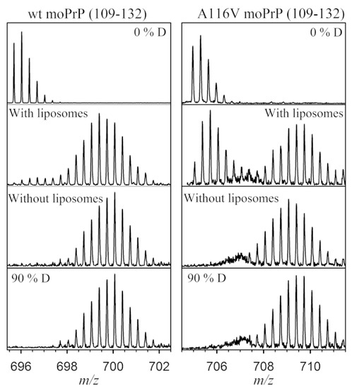 The peptide spanning 109–132 in WT and A116V moPrP displays a significant decrease in deuterium uptake in the presence of liposomes. At 30 s of deuterium labeling, there is a bimodal distribution in the presence of liposomes, compared with the unimodal distribution seen in the absence of liposomes. The controls of protonated (0% D) and deuterated (90% D) peptide fragments are also shown. Reproduced with permission from the Biophysical Society (© 2016).