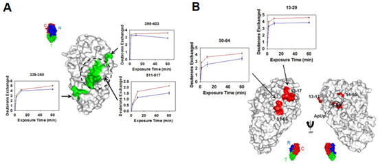 (A) Regions showing decreases in deuterium uptake upon diphtheria toxin (DTx)- monoclonal antibody (mAb) 2–25 complexation are shown in green and mapped onto the structure of DTx. The respective kinetic plots are also shown, with red and blue plots representing the uptake in the absence and presence of mAb 2–25, respectively. A reference structure with labeled domains is shown in the inset, with the dashed circle representing the HBEGF–binding pocket. (B) Regions showing decreases in deuterium uptake upon DTx-mAb 2–18 complexation are shown in red and mapped onto the structure of DTx. The respective kinetic plots are also shown, with red and blue plots representing the uptake in the absence and presence of mAb 2–18, respectively. Reproduced with permission from the American Chemical Society (© 2018).
