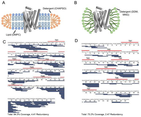 Cartoon illustration of β2-Adrenergic G-protein coupled receptor (GPCR) (β2AR) in (A) a lipid bicelle (3:1 DMPC:CHAPSO) and (B) dodecyl maltoside (DDM). (C) The sequence coverage of β2AR prepared in bicelles and (D) DDM. Blue bars represent peptic peptides identified from four independent experiments. Reproduced with permission from the American Chemical Society (© 2015).