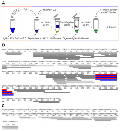 Glycoproteins play a highly diverse function in cells, ranging from cell–cell recognition and immune function to pathogen identification. The study of glycosylated proteins with HDX-MS involves several challenges such as the limited digestion of protein due to steric hindrance from glycans or difficulty in the identification of peptides due to the heterogeneity in the glycan composition. Due to the hydrophilic nature of glycans, they can also interfere with the binding of peptides to the C18 column. Recently, Jensen et al. reported a PNGase A enzyme that can catalyze the deglycosylation of proteins under an acidic pH and a low temperature [70]. The incorporation of this enzyme in the quench buffer can remove the glycan chains and reduce the complexity of the protein sample. The monoclonal antibody Trastuzumab was used as a test subject for this revised HDX-MS workflow. The disulfide bonds in Trastuzumab were reduced using 0.5 M TCEP added to the quench buffer. They were able to detect the deglycosylation of N-linked glycopeptides and compare it to the native state, highlighting the structural changes induced by glycosylation (Figure 12). HDX-MS can also be used to detect how different glycosylations can impact the overall structure of a protein. One recent study was able to distinguish the subtle changes that occur in the idursulfase enzyme when glycosylation sites were modulated [71]. This can have significant applications in the pharmaceutical industry, as monoclonal antibodies produced by different manufacturing processes often have differing glycosylation patterns.