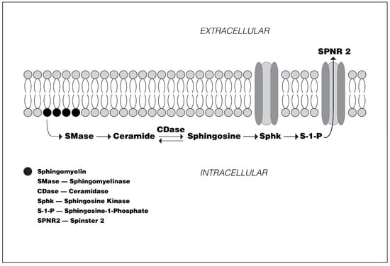 Metabolic Pathway to Sphingosine-1-phosphate Synthesis and Migration from the Intracellular to Extracellular Space via Sphingosine-1-phosphate Transmembrane Transporters.