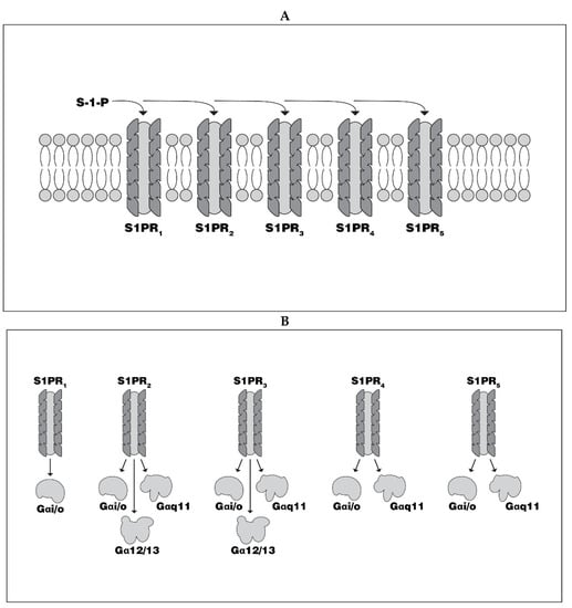 As noted above, S1P is a major intracellular signaling molecule via its G-protein-coupled membrane bound receptors [12,13,14,15]. Because the S1PR subsets are coupled to different G-proteins, they can modulate multiple downstream intracellular pathways (Table 1).