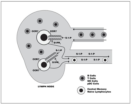 It is now known that S1P, through its interaction with S1PR-1, expressed on the surface of CCR7+ naïve, central memory B, and T cell lymphocytes, regulates the trafficking of these cells from peripheral lymphoid organs [27,28,29,30]. The S1PR-1-expressing lymphocytes egress in response to the S1P gradient (Figure 3). This effect of S1P makes its metabolic and translational pathways attractive potential therapeutic targets for the treatment of cell-mediated immunologic disorders such as MS.
