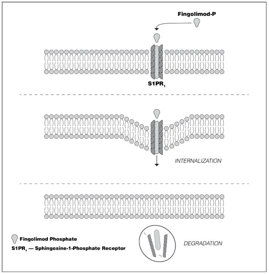 Fingolimod, approved for the treatment of relapsing forms of MS, is a non-selective S1PR modulator, which once phosphorylated (FGM-P) by sk2 [31], has affinity for S1PRs 1, 3, 4, and 5 [7,31]. The interaction of FGM-P with the S1PR-1 on the surface of CCR7+ lymphocytes results in the internalization and degradation of S1PR-1 [32,33] (Figure 4), promoting the sequestration of naïve, central memory T, and central memory B cell lymphocytes in peripheral lymphoid organs [34]. The circulation of central effector B and T cells, which do not express CCR7, are unaffected by FGM-P. When used in patients with relapsing forms of MS, FGM results in robust clinical and MRI evidence of efficacy, in parallel with marked reduction in circulating B and T cell numbers.