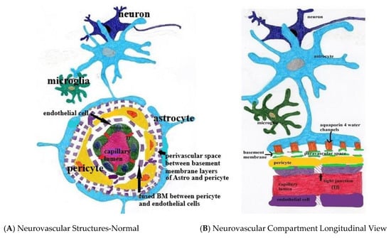 Three main players account for maintaining the metabolic and immunologic integrity of the brain parenchyma. There is the blood–brain barrier (fabricated by endothelial cells and pericytes), the glymphatic system (composed of the paravascular channels, interstitium, and astrocytes), and immune surveillance by microglia/perivascular macrophages (Figure 1). This triumvirate is developmentally and functionally interdependent and as such, must work as a unit to assure proper neuronal function [21,22,23].