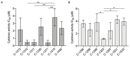Cytotoxic activity of the (A) imidazoacridinones and (B) triazoloacridinones in AR-dependent prostate cancer LNCaP cells. IC50 values were determined after 72 h of treatment based on the dose–response curves and presented as bar graphs. Data are the mean ± SD, n = 3. Significance: One-way ANOVA with Tukey’s multiple comparison test; ** p < 0.01, * p < 0.05.
