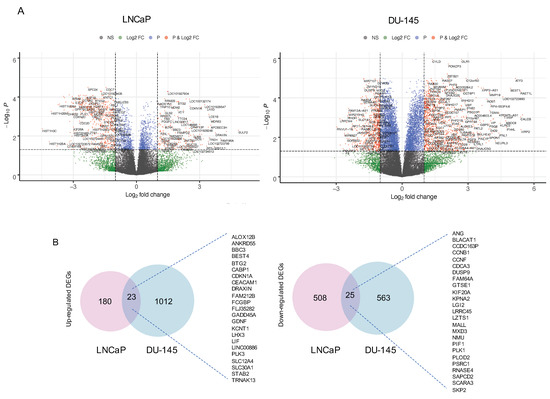 Global changes in the C-1311-regulated transcriptional profile in PCa cells. LNCaP and DU-145 cells were treated with 1 µM C-1311 for 24 h and subjected to RNA-seq analysis (n = 3). (A) Volcano plot of the differently expressed genes in PCa cells exposed to C-1311. The horizontal line at a false discovery rate (FDR) = 0.05; vertical line at |log2FC| = 1. (B) Venn diagram of differentially expressed genes (DEGs) in PCa cells exposed to C-1311.