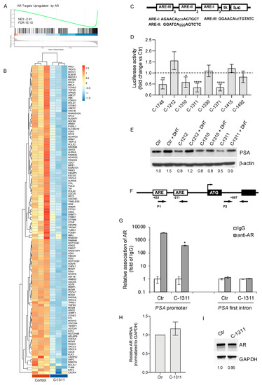 C-1311 blocks transcriptional activity of the androgen receptor (AR). (A) Gene Set Enrichment Analysis (GSEA) plot showing repression of the ‘AR Targets Upregulated by the AR’ gene signature in LNCaP cells treated with 1 µM C-1311 for 24 h. (B) Heat map of DEGs (|log2FC| > 1, FDR < 0.05) identified from the ‘AR Targets Upregulates by AR’ gene signature in LNCaP cells treated with 1 µM C-1311 for 24 h. (C) Schematic representation of the ARE-Luc reporter vector utilized for generation of the LNCaP-ARE-Luc reporter cell line. The ARE-Luc vector contains three copies of each of the three ARE sequences derived from the PSA gene and tk (thymidine kinase) basal promoter. Luc: luciferase gene. (D) AR transactivation assay. LNCaP-ARE-Luc cells were treated with imidazoacridinones at 1 µM for 24 h. Nitroacridine C-1748 (0.01 µM) was used as a reference AR inhibitor [8]. Luciferase activity (fold-change as compared to untreated cells) is shown. Data are the mean ± SD, n = 8. Significance: One-way ANOVA test; **** p < 0.0001, ** p < 0.01, * p < 0.05. (E) Effect of selected imidazoacridinones on the expression of prostate-specific antigen (PSA). LNCaP cells were exposed to 5 µM imidazoacridinone or pre-incubated with 10 nM 5-α-dihydrotestosterone (DHT) to potentiate the transcriptional activity of the AR. The level of PSA was determined 24 h later by Western blotting. Bands were analyzed by densitometry using ImageJ software and normalized to β-actin. Numbers represent a fold change in the PSA level relative to the untreated control cells not stimulated with DHT. (F–G) C-1311 blocks the recruitment of AR to ARE in the PSA promoter. LNCaP cells were treated with 5 µM C-1311 for 8 h followed by ChIP analyses with a control IgG and anti-AR antibody. (F) Schematic diagram showing the position of the AREs located in the proximal PSA promoter. P1 and P2: Locations of the PCR primers used in ChIP-qPCR. ATG: Start codon. (G) The effect of C-1311 on the recruitment of AR to the ARE located in the proximal promoter of the PSA and to the sequences of the first intron of the PSA, as indicated in (F). Binding of AR is shown as the fold enrichment over a normal IgG. Data are the mean ± SD of quadruplicates RT-PCR analyses from a representative ChIP experiment. Significance: Student’s t-test; * p < 0.05 in comparison to the control. (H) Real-time PCR analysis of the AR mRNA level in the LNCaP cells exposed to 1 µM C-1311 for 24 h. Data are the mean ± SD, n = 2. (I) Western blotting analysis of AR protein levels in LNCaP treated as in (H). Numbers represent the fold change in the AR level normalized to GAPDH and expressed relative to the control cells.