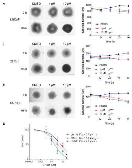 Given that C-1311 is a multi-target therapeutic, we expanded our analysis of its effects on PCa cell lines to include those with a differing AR status. As expected, C-1311 did not significantly change expression of the androgen-regulated genes in AR-negative DU-145 cells (Figure S5). Surprisingly, however, C-1311, as well as other imidazoacridinones, also inhibited the growth of DU-145 cells (Figures S6A,B), and this effect was more pronounced compared to the LNCaP cells (Figure S5A vs. Figure 1A). The C-1311 IC50 value for the DU-145 cells was 0.15 µM, while for the LNCaP cells it was 0.47 µM. To further confirm the efficacy of C-1311 in a more physiologically relevant tumor model, we grew multicellular PCa spheroids in the presence of C-1311 or DMSO. C-1311 treatment significantly decreased the diameter of the LNCaP and DU-145 cell spheroids in a time-dependent manner (Figure 4A–C). In addition, C-1311 effectively blocked the growth of the spheroids formed from 22Rv1 cells. These cells have partial androgen sensitivity due to the expression of both a full-length AR and a constitutively active AR splice variant, AR-V7, which lacks the ligand-binding domain [39]. As such, the 22Rv1 cells serve as a model for a transition phenotype between that of androgen-sensitive LNCaP and AR-negative DU-145 cells [39].