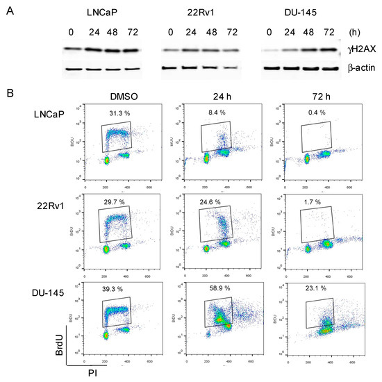 Next, we assessed the effect of C-1311 on the biological response of the PCa cells. C-1311, as a topoisomerase II inhibitor, has been previously demonstrated to induce DNA damage [16]. Correspondingly, we found that C-1311 treatment in LNCaP, 22Rv1, and DU-145 cells increased the phosphorylation of the histone H2AX (γH2AX) (Figure 5A), a well-known marker of DNA damage [40]. In addition, as shown by the BrdU incorporation assay, C-1311, within 72 h of treatment, significantly reduced the percentage of cells actively replicating DNA (Figure 5B). In LNCaP cells, a decrease in the BrdU-positive cell fraction was already evident within 24 h of treatment, while in 22Rv1 and DU-145 cells, a 72 h treatment was required to achieve a similar effect.