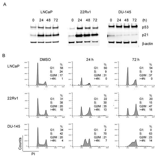 Following the drug treatment, cells were lysed for 20 min on ice with buffer containing 50 mM Tris-HCl (pH 7.4), 5 mM EDTA 1% Nonidet P-40, 150 mM NaCl, 0.1% SDS, 0.5% sodium deoxycholate, 50 mM NaF, 50 mM β-glycerolophosphate, 1 mM PMSF, 1 mM sodium orthovanadate, and a protease inhibitor cocktail (Roche Applied Science, Basel, Switzerland). Proteins (50 μg) were separated by SDS-PAGE and transferred to PVDF membranes. The following antibodies were used: anti-PSA (#5877 Cell Signaling Technology, Danvers, MA, USA), anti-AR (#5153S Cell Signaling Technology), anti-GAPDH-HRP conjugate (#8884S Cell Signaling Technology), anti-γH2AX (#05-636-I, Millipore, Burlington, MA, USA), #anti-p53 (DO-I, Santa Cruz Biotechnology, Dallas, TX, USA), anti-p21 (#2947 Cell Signaling Technology), anti-PARP (#9542 Cell Signaling Technology), and anti-β-actin (C4, Santa Cruz Biotechnology, Dallas, TX, USA). Immunoblots were developed using the Li-COR Odyssey imaging system, except for the anti-PSA, anti-AR, and anti-GAPDH-HRP conjugate, which were visualized using an enhanced chemiluminescence detection kit, the SuperSignal West Pico Chemiluminescent Substrate (Thermo Fisher Scientific, Waltham, MA, USA).