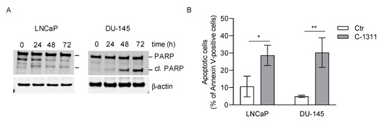 Western blot analysis confirmed that changes in the expression of the apoptosis-related genes were accompanied by those typical for apoptosis, cleavage of PARP (Figure 7A). Similarly, flow cytometric analysis of Annexin V staining of cell surface phosphatidylserine, supported the observations that C-1311 was able to induce apoptosis in both LNCaP and DU-145 cells (Figure 7B and Figure S8).