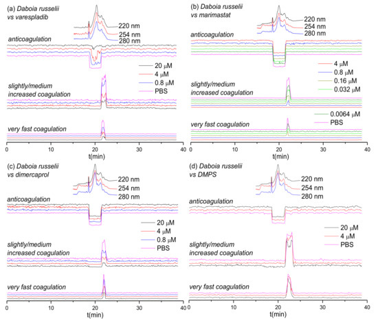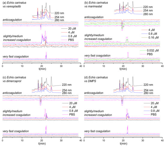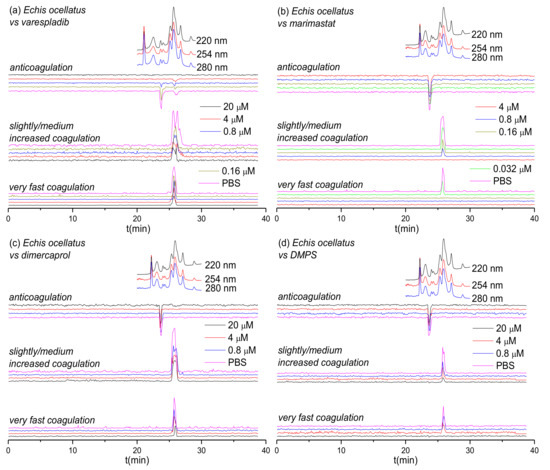 UV absorbance chromatograms reconstructed coagulopathic toxicity chromatograms of nanofractionated toxins from E. ocellatus venom in the presence of different concentrations of (a) varespladib, (b) marimastat, (c) dimercaprol and (d) DMPS.