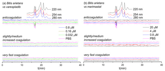 UV absorbance chromatograms and reconstructed coagulopathic toxicity chromatograms of nanofractionated toxins from B. arietans venom in the presence of different concentrations of (a) varespladib and (b) marimastat.