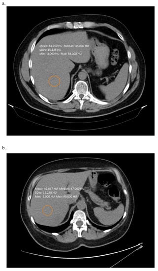 - Lee, S.S.; Park, S.H.; Kim, H.J.; Kim, S.Y.; Kim, M.Y.; Kim, D.Y.; Suh, D.J.; Kim, K.M.; Bae, M.H.; Lee, J.Y.; et al. Non-invasive assessment of hepatic steatosis: Prospective comparison of the accuracy of imaging examinations. J. Hepatol. 2010, 52, 579–585. [Google Scholar] [CrossRef] [PubMed]