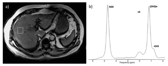 - Thomsen, C.; Becker, U.; Winkler, K.; Christoffersen, P.; Jensen, M.; Henriksen, O. Quantification of liver fat using magnetic resonance spectroscopy. Magn. Reson. Imaging 1994, 12, 487–495. [Google Scholar] [CrossRef]