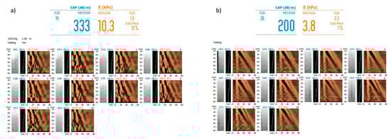 - Sasso, M.; Beaugrand, M.; de Ledinghen, V.; Douvin, C.; Marcellin, P.; Poupon, R.; Sandrin, L.; Miette, V. Controlled attenuation parameter (CAP): A novel VCTE™ guided ultrasonic attenuation measurement for the evaluation of hepatic steatosis: Preliminary study and validation in a cohort of patients with chronic liver disease from various causes. Ultrasound Med. Biol. 2010, 36, 1825–1835. [Google Scholar] [CrossRef]
