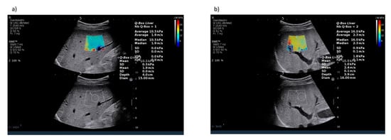 - Popescu, A.; Bota, S.; Sporea, I.; Sirli, R.; Danila, M.; Racean, S.; Suseanu, D.; Gradinaru, O.; Ivascu Siegfried, C. The influence of food intake on liver stiffness values assessed by acoustic radiation force impulse elastography-preliminary results. Ultrasound Med. Biol. 2013, 39, 579–584. [Google Scholar] [CrossRef]