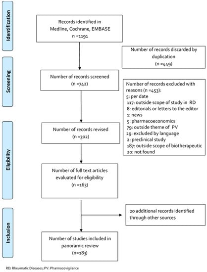 We included post-marketing studies on biotherapeutic drugs used for the treatment of RD: rheumatic disease (RA), juvenile idiopathic arthritis, (JIA), psoriatic arthritis (PsA), ankylosing spondylitis (AS), ankylosing spondylitis (SLE), and cryopyrin-associated autoinflammatory syndromes (CAPS). Only articles in Spanish, English, German, and French were included. News articles, phase I-III studies, and experimental studies were excluded from the review.