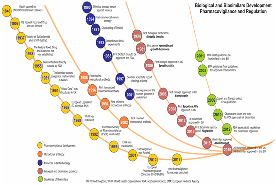 Timeline of pharmacovigilance and regulation of biopharmaceuticals and biosimilars.