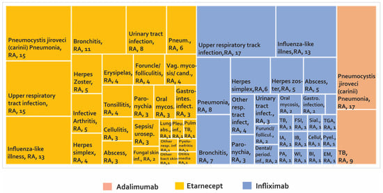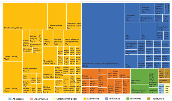 According to Figure 4 and supplementary Table S2, 102 AE are found in case series studies and case reports, with a higher number of reports for etanercept and infliximab. Among the AE that were presented most frequently, the following were found: (1) Crohn’s disease with more frequency of reporting in AS, JIA, PA with 11, 11, and seven cases, respectively, in patients treated with etanercept [92]. (2) Pneumocystis jiroveci (carinii) pneumonia was reported in RA with 49 cases in patients treated with infliximab, followed by Crohn’s disease in patients treated with etanercept in nine cases. (3) In seronegative arthritis, one case of reversible cerebral vasoconstriction was reported. (4) Thymic tumours, melanoma and sarcoidosis have been reported in spondyloarthropathy. (5) In SLE, three cases of progressive multifocal leukoencephalopathy (PML) with rituximab have been reported. (6) Studies on patients with RD reported two cases of multiple sclerosis with adalimumab, one with etanercept, and two with infliximab.