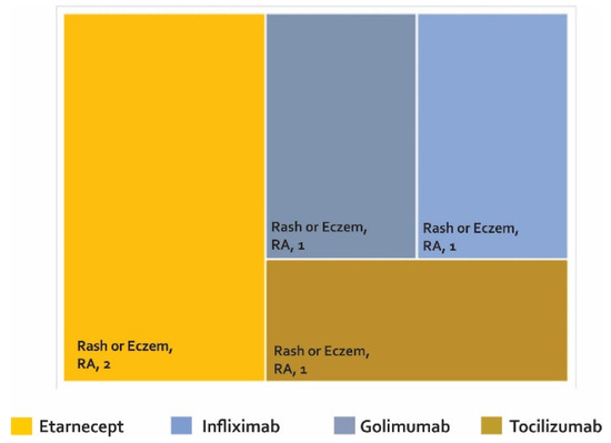 Only one cross-sectional study was found (Figure 5 and supplementary Table S3), which found rash or eczema in two cases treated with etanercept and in one patient treated with golimumab, infliximab, and tocilizumab.