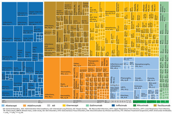 Other studies on AE were found in pregnant patients with RD and treated with biological therapies with tocilizumab or certolizumab pegol. The AE for tocilizumab were renal pielectasis, oesophageal fistula, cardiovascular malformations, and alterations in the development of the central nervous system (CNS), as well as reports of abortion [172,173]. In the case of certolizumab, the AE reported were abortion, in addition to accessory atrium, anal fistula, hydrocephalus, macrosomia, and polydactyly in neonates [174]. In infants, cetolizumab pegol is associated with respiratory infections, gastroesophageal reflux, and lichen striatus as AE, while in mothers, breast abscesses, respiratory infections, and headaches were reported [175].