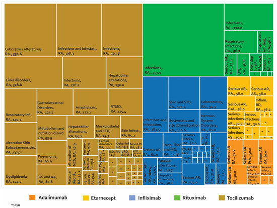 Once the phase of controlled clinical trials has been passed and after approval by a regulatory entity, the number of people exposed to a drug increases exponentially. This could make the detection of AE easier, especially AE that perhaps were not identified in the early stages of development. It is estimated that the number of patients treated with etanercept after the approval of this biotherapeutic is more than 39 times the number of patients evaluated in clinical studies with RA, PsA, and JIA. For infliximab, it is estimated that 175 times the number of patients evaluated with RA in clinical studies have been monitored after marketing [68]. The development of phase IV studies makes new alerts visible in PV constructed from studies such as (i) case reports and case series (Figure 4), (ii) cross-sectional studies (Figure 5), (iii) cases and controls (Figure 6), and (iv) cohorts (presented by percentages) (Figure 7) and cases presented as 1000 patients/year (Figure 8). Supplementary Tables S2–S6 present the evidence found on the main AE documented in the post-marketing phase. The Table 3 shows the principal AE in RDs associated with biological drug treatment.