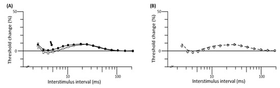 Nerve excitability parameters were recorded using TRONDNF protocol with QTRACS software (©Institute of Neurology UCL, 2017, London, UK). This protocol included five testing paradigms yielding outputs of stimulus response behavior, strength duration relationship, threshold electrotonus (TE), current–threshold (I/V) and the recovery cycle [22,23]. Briefly, a maximal response is elicited using 1 ms stimuli that is incrementally increased; the software then establishes the stimulus required to generate a target response or ‘threshold’ (40% of maximal compound action potential). Deviations in the threshold were then measured following a range of conditioning stimuli including depolarizing and hyperpolarizing currents of up to 100 ms duration (TE) and up to 200 ms duration (I/V) [23,24]. The recovery cycle used a supramaximal conditioning stimulus with the threshold measured at multiple timepoints over the subsequent 200 ms. This parameter assesses the restoration of axonal excitability following a supramaximal stimulus and provides a measure of refractoriness (measured at 2.5 ms), superexcitability (measured at 5 ms) and subexcitability [23].
