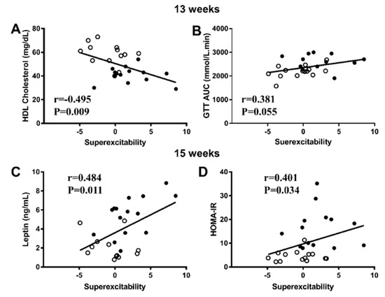 Correlations between superexcitability and metabolic parameters at 13 weeks and 15 weeks of diet. (A,B) Correlations between superexcitability and fasting blood HDL cholesterol and glucose tolerance test (GTT) AUC 180 min at 13 weeks of diet and (C,D) correlations between superexcitability and fasting plasma leptin and HOMA-IR calculated based on fasting blood glucose and fasting plasma insulin concentrations at 15 weeks of diet. Data are presented as scatterplots of individual values where open points indicate chow rats and black points indicate CAF rats. HDL, GTT and leptin data were analyzed by Pearson correlations whereas HOMA-IR was analyzed by Spearman correlation, n = 26–28.