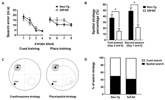 Performance of 4-month-old 5XFAD and non-Tg control mice in the switching task from cued/response training to place/spatial training. (A) No significant difference between non-Tg and 5XFAD mice in search error was observed in the cued/response training and place/spatial training. (B) 5XFAD mice adopted the spatial search strategy less in the place/spatial training than did control mice. (C) Representative figure of the swim path in the competition test. (D) No difference between 5XFAD and control mice in the preference for a search strategy in the competition test was found. Non-Tg, n = 14; 5XFAD, n = 14. * p < 0.05.