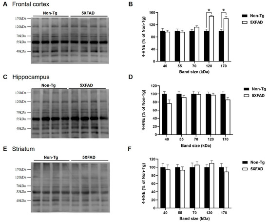 Increased levels of 4-HNE protein adducts in the frontal cortex of 4-month-old 5XFAD mice. Representative immunoblots of the frontal cortex (A), hippocampus (C), and striatum (E) of 4-month-old 5XFAD and non-Tg control mice. Five bands with evident immunoreactivity (40, 55, 70, 120, and 170 kDa) were selected and normalized according to 55 kDa band of Ponceau S staining. 4-HNE levels in the frontal cortex (B), hippocampus (D), and striatum (F) of 5XFAD mice represented as a percentage of the levels in non-Tg control mice. (B) 4-HNE levels in the frontal cortex of 5XFAD mice were significantly higher than those in non-Tg mice in specific band sizes (120 and 170 kDa). In the hippocampus (D) and striatum (F), no significant differences between the two mice were observed in any band size. Non-Tg, n = 6–8; 5XFAD, n = 6–8; * p < 0.05.