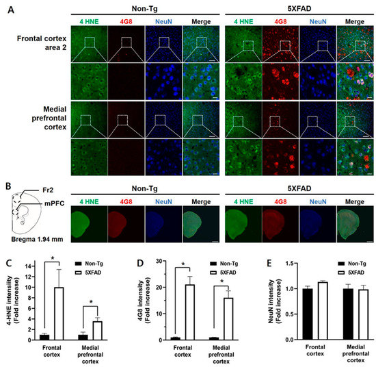 Triple immunofluorescence staining of the frontal cortex of the 4-month-old non-Tg control and 5XFAD mice. (A) Confocal microscopic images of triple immunofluorescence with 4-HNE, 4G8, and NeuN antibodies in the frontal cortex area 2 (Fr2) and medial prefrontal cortex (mPFC). (B) Schematic diagram of the analyzed brain regions and half-brain immunofluorescence images. The dashed circles in the diagram indicate the regions of interest. (C) 4-HNE levels in the Fr2 and mPFC in 5XFAD mice were significantly higher than those in control mice. (D) Aβ levels in the Fr2 and mPFC in 5XFAD mice were significantly higher than those in control mice. (E) There was no difference in the intensities of the NeuN-positive signal. Top row: scale bar indicates 100 μm; bottom row: scale bar indicates 20 μm. Non-Tg, n = 4; 5XFAD, n = 6. * p < 0.05.
