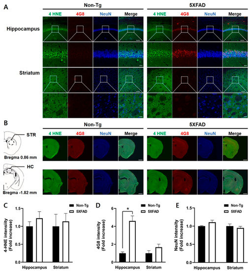 Triple immunofluorescence staining of the hippocampus and striatum of the 4-month-old non-Tg control and 5XFAD mice. (A) Confocal microscopic images of triple immunofluorescence with 4-HNE, 4G8, and NeuN antibodies in the hippocampus (HC) and striatum (STR). (B) Schematic diagram of the analyzed brain regions and half-brain immunofluorescence images. The dashed circle line in the diagrams indicates the region of the interest. (C) No differences between the two groups in the 4-HNE levels of the hippocampus and striatum were found. (D) Levels of 4G8-positive signals were significantly higher in the hippocampus of 5XFAD than that in control mice, but not in the striatum. (E) No differences in intensities of NeuN-positive signals were found between the two groups. Top row: scale bar indicates 100 μm; bottom row: scale bar indicates 20 μm. Non-Tg, n = 4; 5XFAD, n = 6. * p < 0.05.