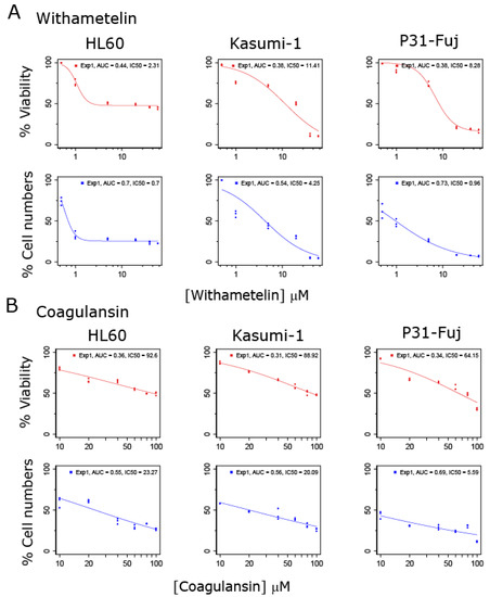 Impact of withanolides in reducing cell viability and proliferation of acute myeloid leukemia (AML) cell models. Percentage of viable cells and number of cells relative to control was determined as a function of treatment with withametelin (WTH) (A) or coagulansin A (CoA) (B) in the named cell lines. IC50 was determined using the pharmacoGx package in R.